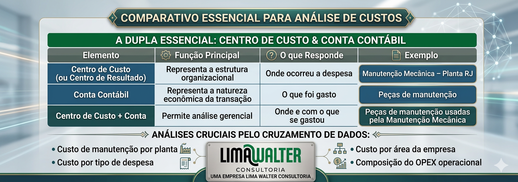 | Centro de Custo + Conta | Permite análise gerencial | Onde e com o que se gastou | Peças de manutenção usadas pela Manutenção Mecânica |
