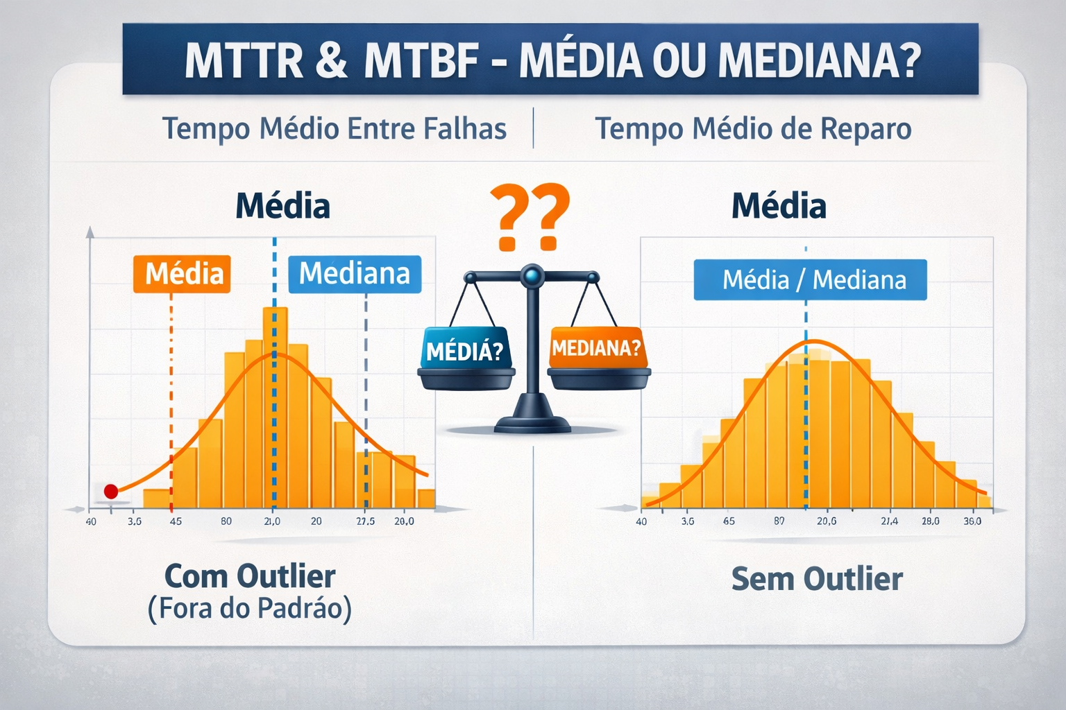 Para expressar a “verdade” dos indicadores MTBF (Tempo Médio Entre Falhas) e MTTR (Tempo Médio de Reparo), a análise estatística demonstra que a escolha entre média e mediana depende diretamente da distribuição dos dados e da presença de valores atípicos (outliers ou fora do padrão).